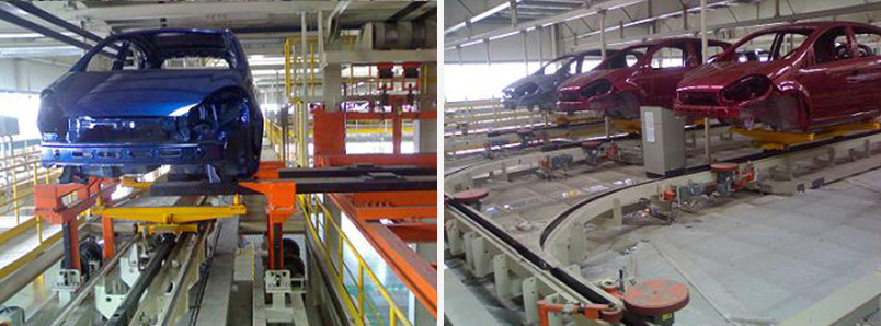 該系統(tǒng)采用空中、地面摩擦線,主要用于:P11/P12、B13的白車(chē)身骨架輸送,簡(jiǎn)稱(chēng)為轉(zhuǎn)運(yùn)線,P11/P12/B13/H13/S22/A18白車(chē)身整車(chē)焊裝到涂裝下件點(diǎn)的輸送和存儲(chǔ),簡(jiǎn)稱(chēng)存儲(chǔ)線。該摩擦線能滿足前六種車(chē)型的同時(shí)共線生產(chǎn)輸送用。