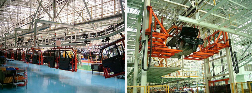 長(zhǎng)豐汽車(chē)公司永州基地新總裝車(chē)間輸送系統(tǒng)是為了適應(yīng)不斷擴(kuò)大的產(chǎn)量而新建的,批量年產(chǎn)5萬(wàn)輛,分底盤(pán)線、內(nèi)飾線、車(chē)門(mén)線以及上下轉(zhuǎn)掛用的升降機(jī)及隨動(dòng)裝置,車(chē)身底盤(pán)裝配輸送機(jī)系統(tǒng)是YTJ6型號(hào)的輸送機(jī)組成,共由一條快鏈和一條慢鏈組成,工藝速度1-2.5m/min,鏈條長(zhǎng)度約780米,小車(chē)積放長(zhǎng)度5300mm,工位間距6128mm,小車(chē)組采用6車(chē)組型式,小車(chē)數(shù)27套。內(nèi)飾線采用YTJ6型號(hào)的輸送機(jī),共由一條快鏈和一條慢鏈組成,工藝速度1-2.5m/min,鏈條長(zhǎng)度約500米,小車(chē)積放長(zhǎng)度5300mm,工位間距6128mm,小車(chē)組采用6車(chē)組型式,小車(chē)數(shù)24套。車(chē)門(mén)線采用YTJ4型號(hào)的輸送機(jī),共由兩條快鏈和一條慢鏈組成,工藝速度1-2.5m/min,鏈條長(zhǎng)度約1200米,小車(chē)積放長(zhǎng)度3500mm,工位間距4300mm,小車(chē)組采用3車(chē)組型式,小車(chē)數(shù)85套。