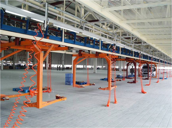 輸送系統(tǒng)包括:1、PBS系統(tǒng),采用摩擦式輸送系統(tǒng),用于漆后車身的輸送、存儲(chǔ)和排序;2、SUV內(nèi)飾裝配線采用CPC+空中摩擦輸送系統(tǒng),內(nèi)飾工藝鏈采用CPC,內(nèi)飾-底盤線及空抱具返回采用空中摩擦輸送;3、移載設(shè)備自動(dòng)完成漆后車身從涂裝滑撬到PBS臺(tái)車及內(nèi)飾線的移載工作;4、PBS識(shí)別及控制系統(tǒng)采用現(xiàn)場(chǎng)總線,便于維護(hù)和系統(tǒng)調(diào)試。