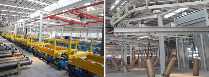綜合油缸涂裝生產(chǎn)線采用XT160懸掛輸送機(jī)輸送工件,輸送速度在0.5-3m/min內(nèi)可調(diào),工作速度1.6m/min;變幅油缸涂裝生產(chǎn)線采用積放式懸掛輸送機(jī),工件上下件出設(shè)有液壓升降臺配合工件上下輸送設(shè)備;伸縮油缸涂裝生產(chǎn)線采用地面小車輸送工件,地面小車采用四套垂直地面鏈輸送裝置輸送工件。