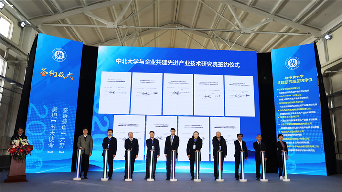 2020年12月23日,中北大學(xué)科技成果推介洽談暨共建先進(jìn)產(chǎn)業(yè)技術(shù)研究院簽約揭牌儀式在中北大學(xué)隆重舉行。山西省人民政府副省長(zhǎng)王一新、中北大學(xué)黨委書(shū)記沈興全、中北大學(xué)校長(zhǎng)熊繼軍出席會(huì)議,山西省政府辦公廳主任趙國(guó)光主持,副省長(zhǎng)王一新為共建先進(jìn)產(chǎn)業(yè)技術(shù)研究院揭牌。